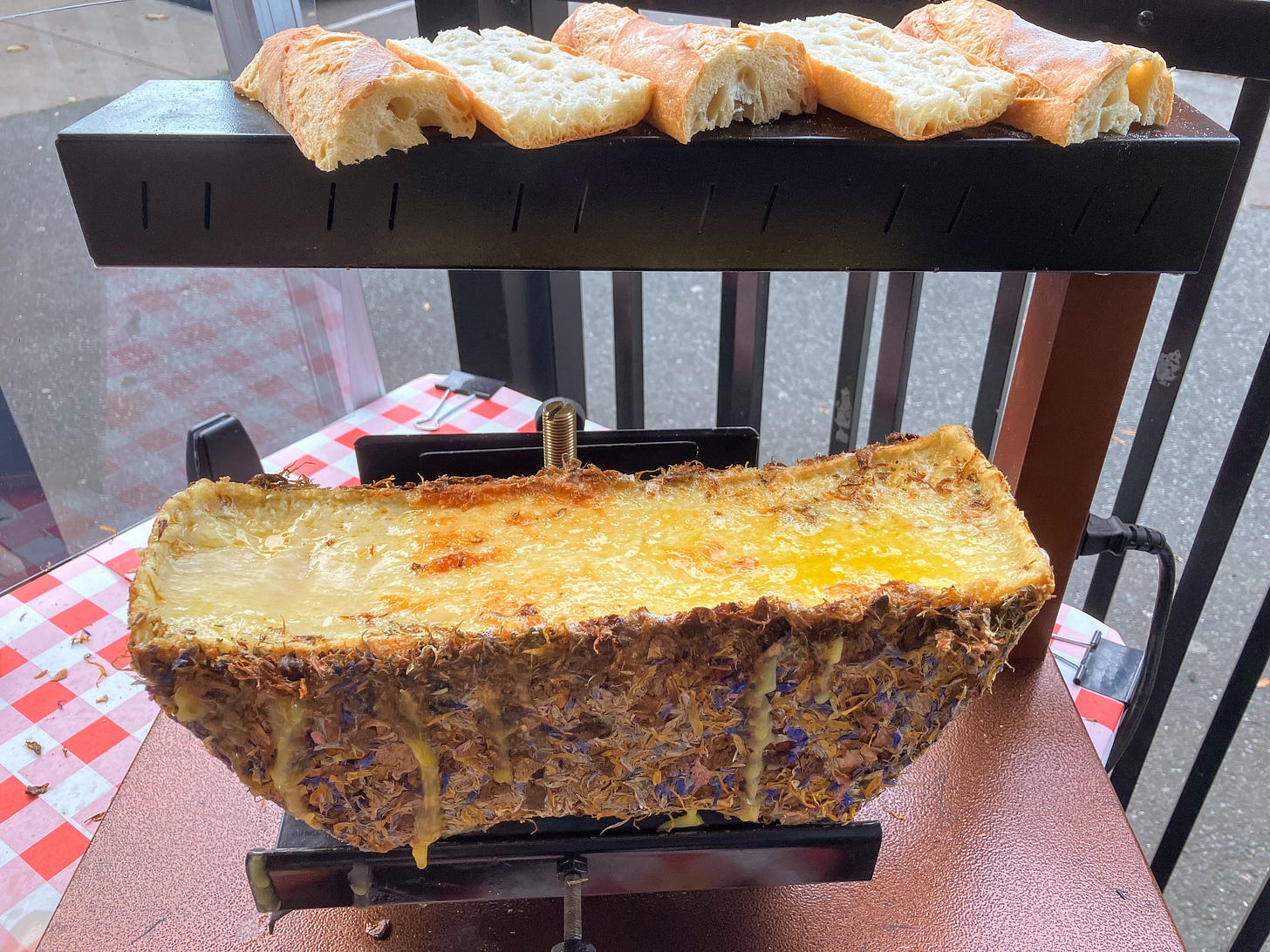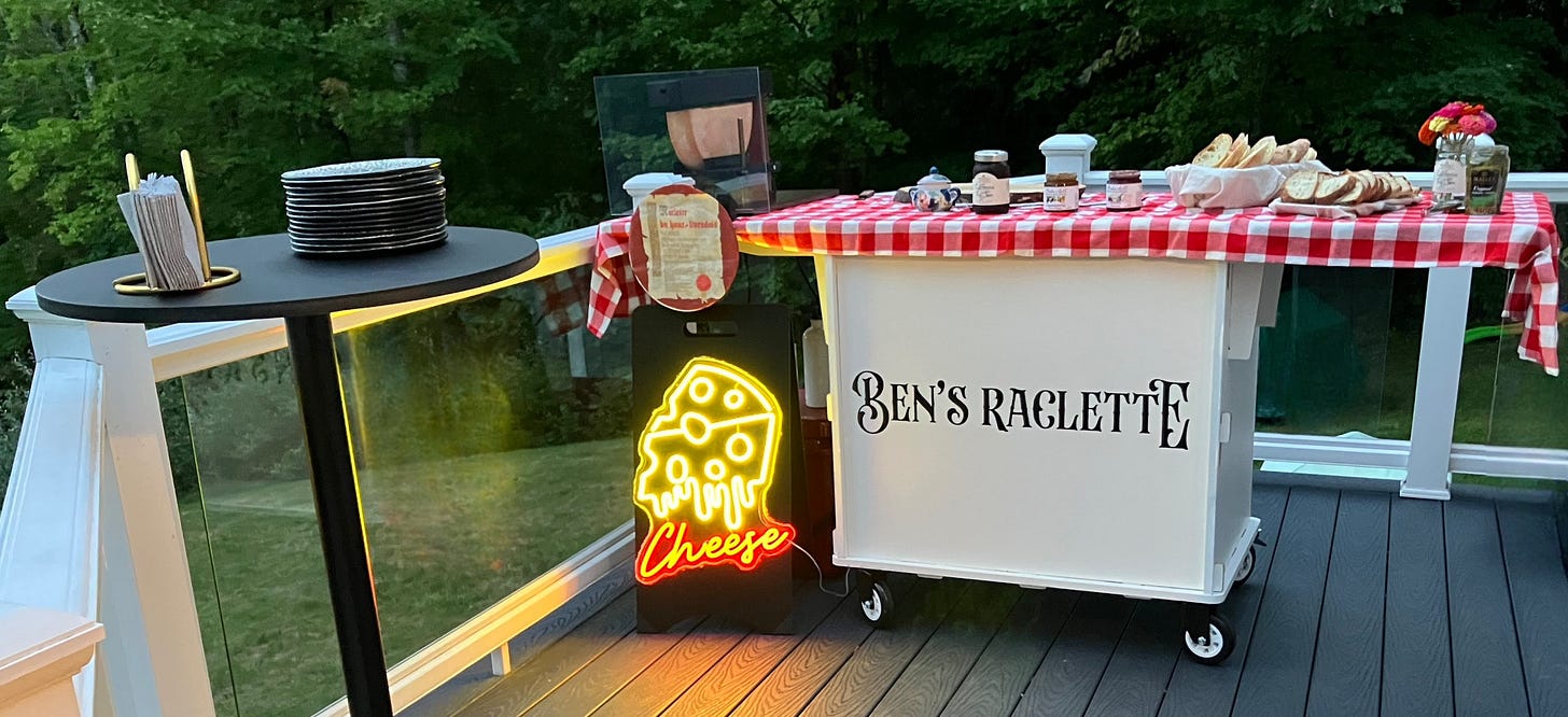 A delicious and more convenient option would be to hire a raclette professional, such as Ben’s Raclette! We’ll serve your guests Alpine cheese by the half-wheel from smaller farms in France and Switzerland. We’ll prepare the baguettes, toppings, cornichons, and other accompaniments such as roasted potatoes and charcuterie.